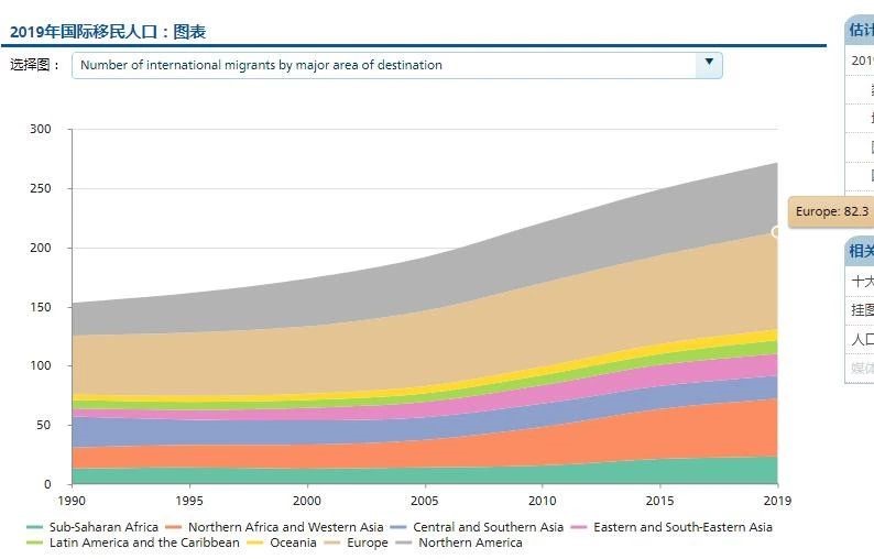 從移民接收地區來看,歐洲接收的移民人數最多,達到8200萬人,北美接收5900萬移民排名第2。