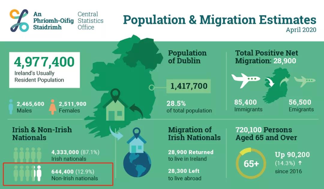 據(jù)愛(ài)爾蘭中央統(tǒng)計(jì)局發(fā)布的最新數(shù)據(jù),截至2020年4月,愛(ài)爾蘭共有498萬(wàn)居民,其中外國(guó)移民增至64.44萬(wàn)人,占愛(ài)爾蘭總?cè)丝诘?2.9%。