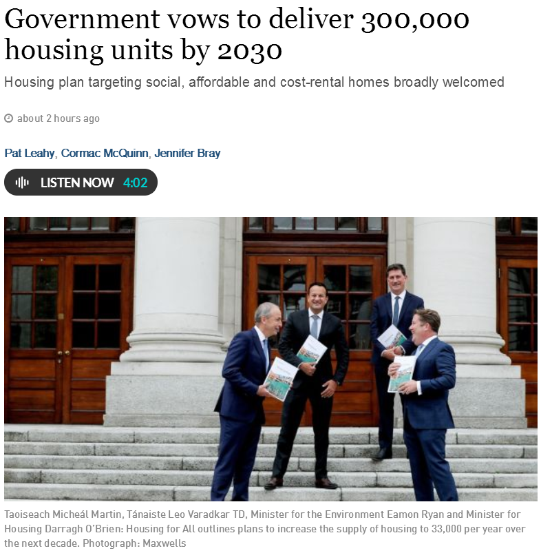 愛爾蘭住房部長Darragh O'Brien表示,該計劃是"我們歷史上最大的國家建設計劃",政府承諾每年提供40億歐元用于住房建設,并承諾在2022年至2030年底之間建造312750套新住房。