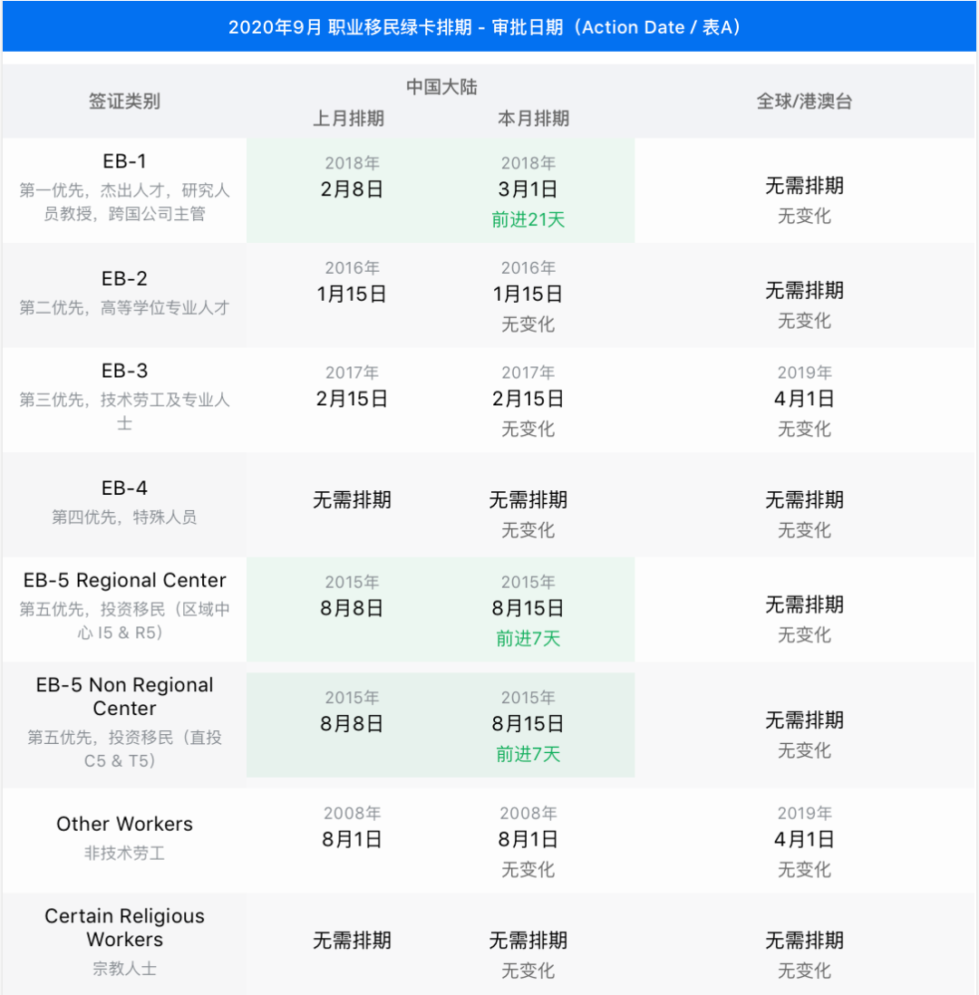 8月19日,美國(guó)國(guó)務(wù)院簽證辦公室公布了2020年9月的簽證公告牌。表A最終裁定日(FAD)時(shí)間為2015年8月15日,前進(jìn)一周;表B遞交申請(qǐng)日(DFA)時(shí)間為2015年12月15日,維持不變。