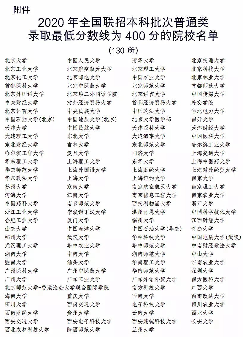 (一)普通類院校(專業(yè))文史、理工類:300分(其中,部分院校執(zhí)行400分,院校名單見附件);