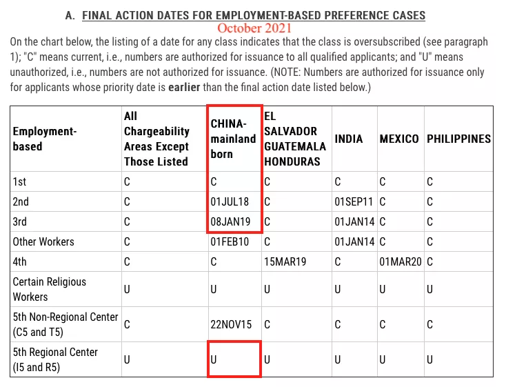 EB-5直投類別排期停在2015年11月22日;EB-5區(qū)域中心類別顯示“U”,受法案到期影響暫停使用。