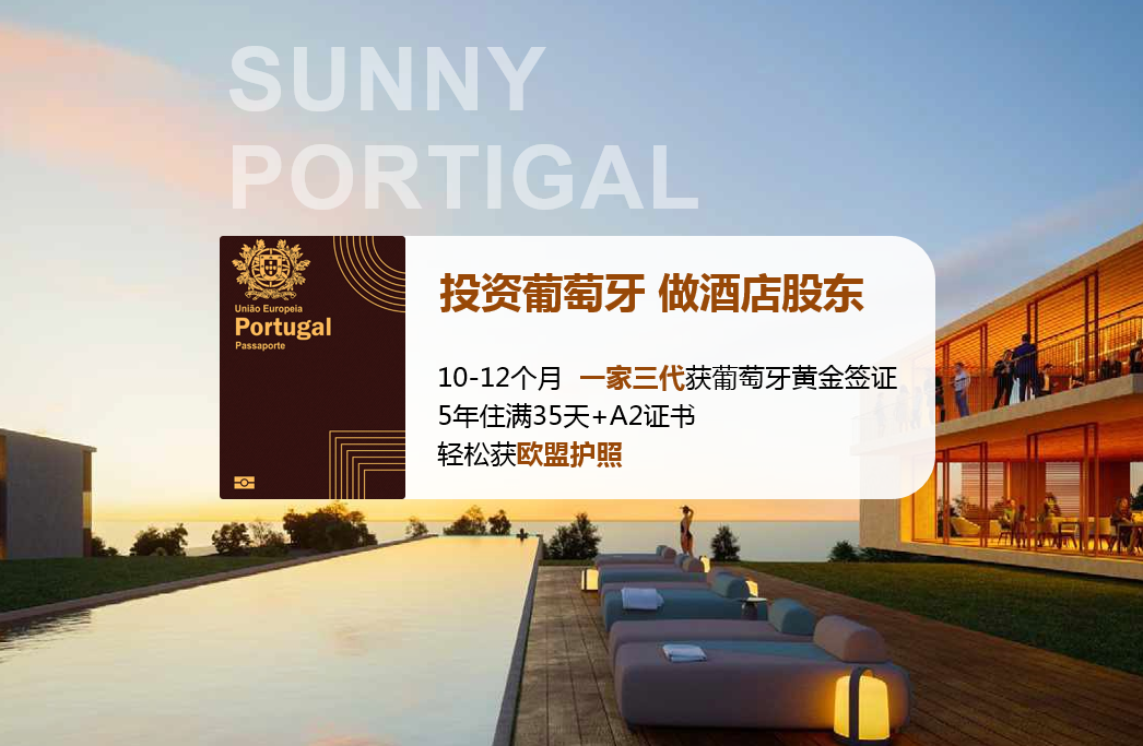 永銘國際精選葡萄牙里斯本、波爾圖、阿爾加維等熱門旅游地五星級酒店投資項目,投資28萬歐起,一家三代獲葡萄牙黃金簽證。無持有成本、無酒店管理稅費、無需自己打理、提供每年7天免費住宿。持黃金簽證5年住滿35天,并考取葡語A2證書,即可拿歐盟護照,自由定居歐洲31國,免簽全球180多國。