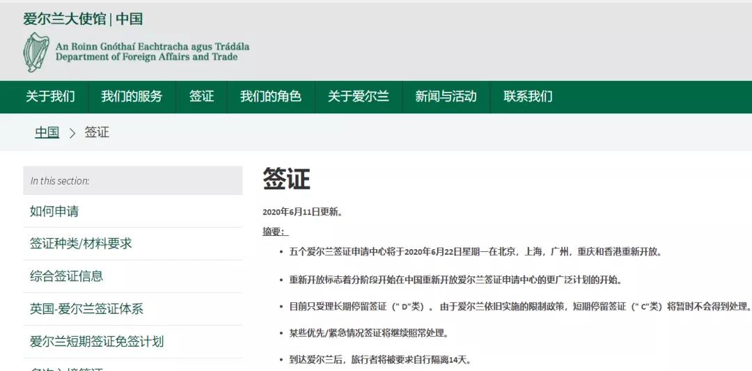 6月11日,愛爾蘭大使館宣布,將于6月22日星期一在北京、上海、廣州、重慶和香港重新開放五個簽證申請中心(VAC)。這是重新開放所有中國簽證中心計劃的第一步,其他簽證申請中心未來幾個月將逐步開放 。