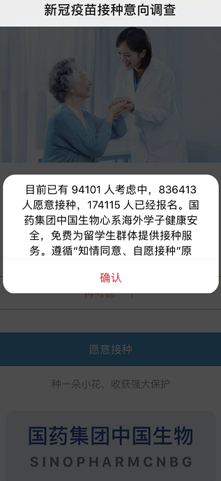 不過,查詢國藥集團官網暫未發現報名通道,同時有公開報道顯示,一款“新冠疫苗接種預約”(新冠疫苗接種意向調查)的小程序在不久前的2020年中國國際服務貿易交易會上已經亮相國藥集團中國生物展臺。以上該款小程序的調查結果顯示,截至目前,已經有接近40萬人表示“愿意接種”,并有超過7萬人已經報名接種。該款小程序上還顯示,將免費為留學生群體提供接種服務。